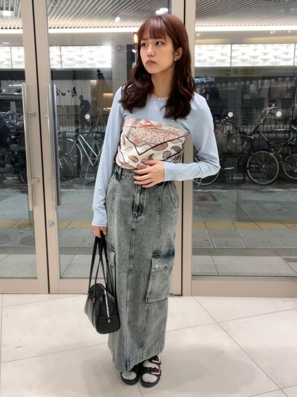 閲覧いただきありがとうございます🤍 デニムスカートでコーディネートを組んでみました! 後ろにはしっかりスリットが入っていて歩きやすいデザインになっています👏 バンダナは1つ持っていれば色々な使い方が出来てオススメです◎ シンプルなトップスでもバンダナを巻くだけでオシャレに着こなせます💃