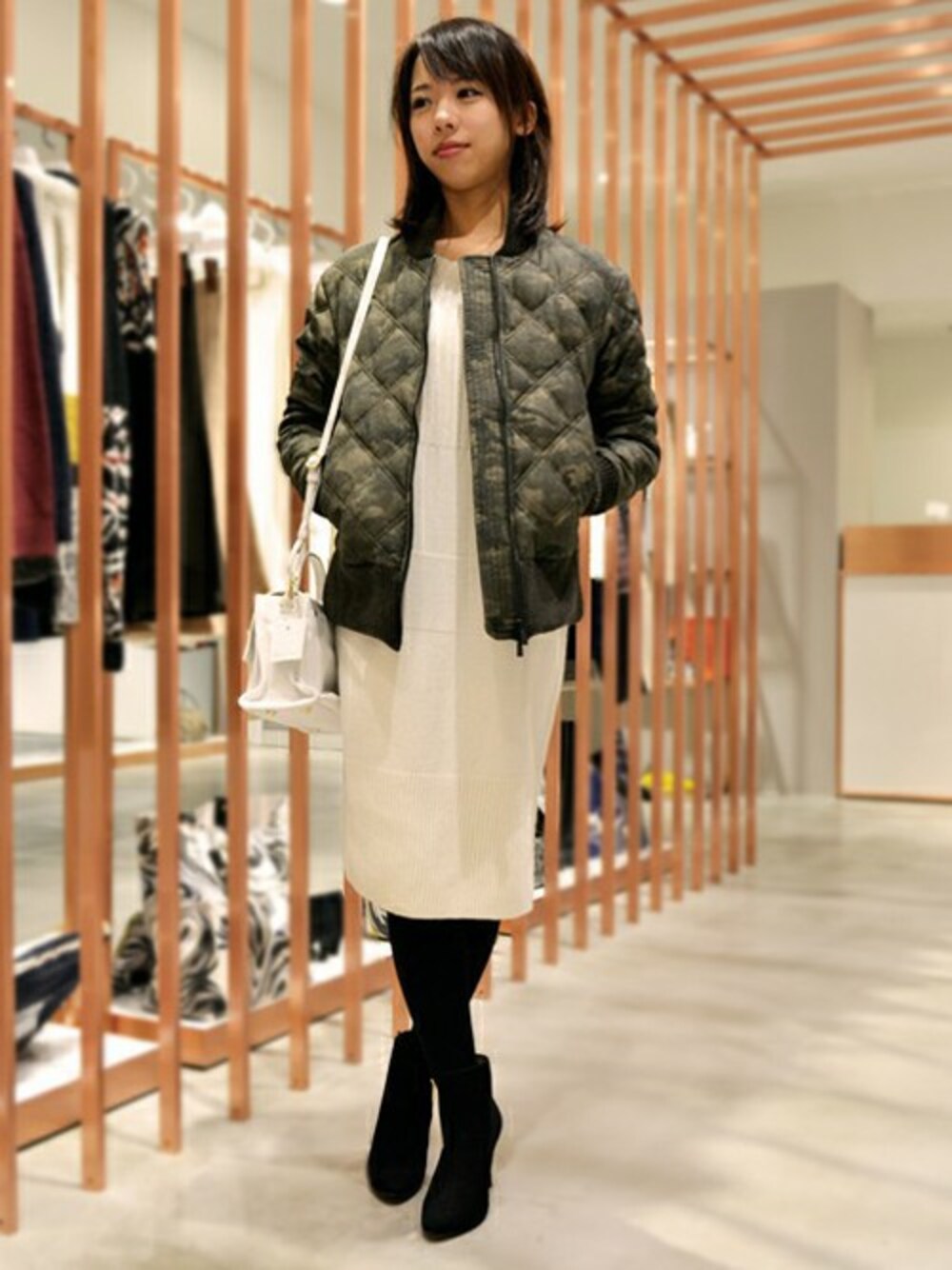 TATRASオリジナルのカモフラージュ柄をプリントしたブルゾンタイプのダウンジャケットTATRAS R LINE『VALENTINA』 メンズライクのブルゾンタイプはカジュアル色の強いアイテムですが、白のニットワンピースで大人の上品さをIN。 幅広いコーディネイトで使えるブラックのブーツで足元はシンプルに。 週末のお出かけコーデにいかがでしょうか。