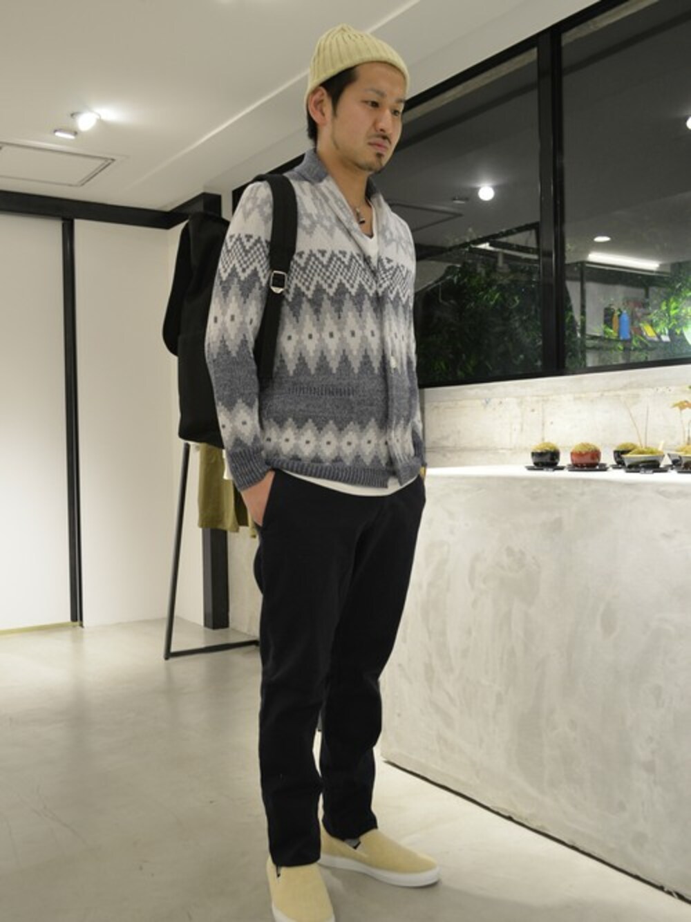 Seagreen定番ショールカラーカーディガンの15S/S新作です。サーフやアメカジテイストを存分に盛り込んだカーディガンは柔らかい素材感と着用感が特徴です。 春らしい配色とウッドボタンに白のかすれたユーズド感のあるペイントを施しているところは、拘りを感じるポイントです。 SOLIDOのテーパードチノは、美脚パンツとしてリピートユーザーの多いアイテムです。 カジュアルスタイルにもジャケパンスタイルにも合わせられる万能パンツとしても好評のこちらはストレッチも効いていて穿き心地抜群で一度穿いたら癖になります。 今回は大人の休日カジュアルスタイルテーマにでスタイリングしてみました。足元はボリュームを抑えたスリッポンで、スッキリした印象にしています。