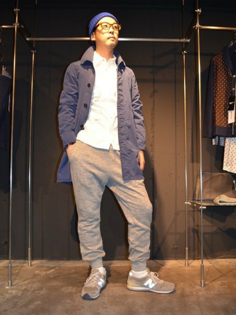 アメカジを基調とした、リラックス感のある大人カジュアル。 春先にあると重宝するステンカラーコート、今年流行のスポーツテイストを取り入れ、 あえてラフなスエットパンツやスニーカーを合わせたリラックス感のある着こなしです。