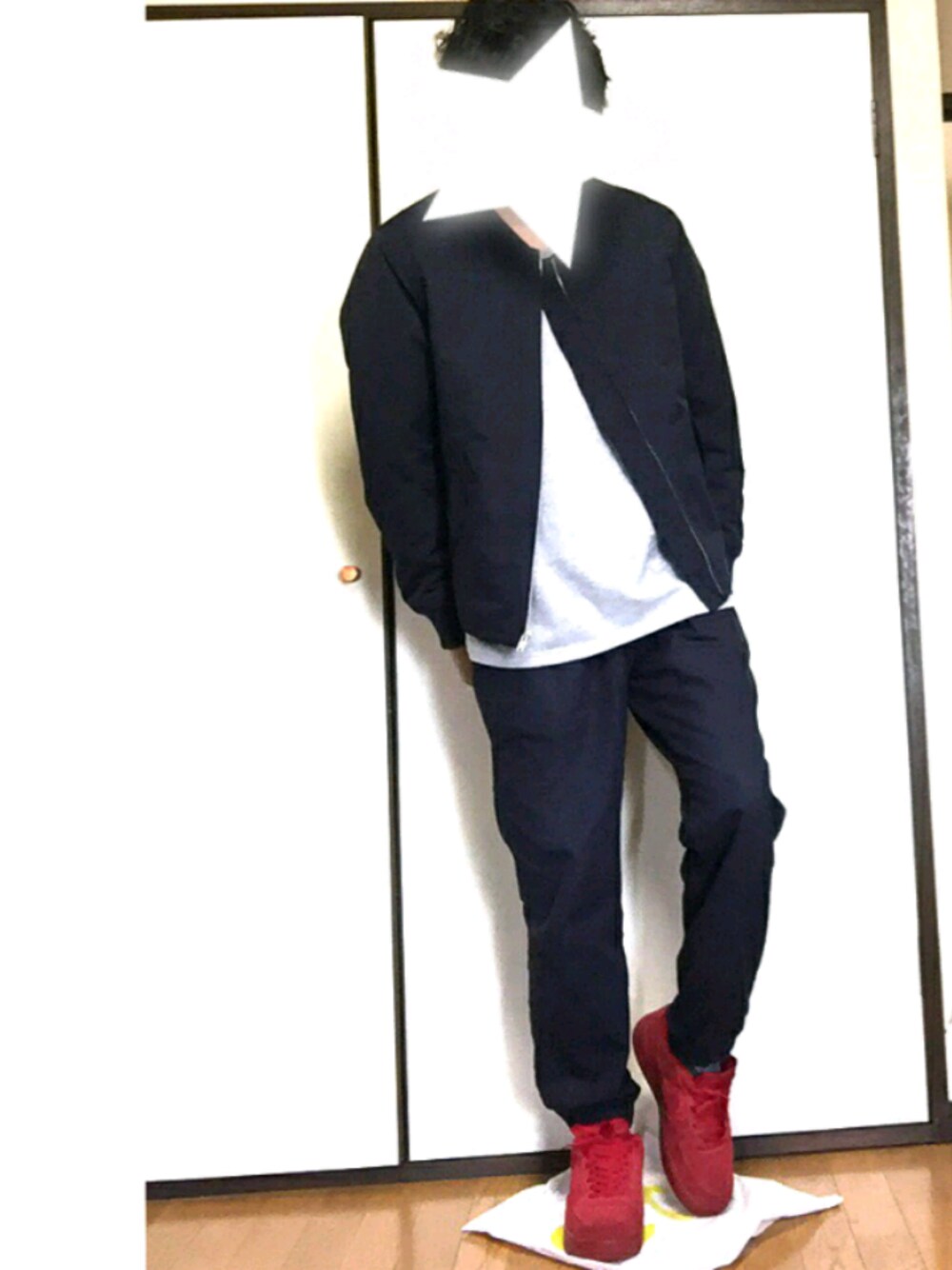 暖かい。 赤スニーカーの主張が強いので、他の色を抑えています。