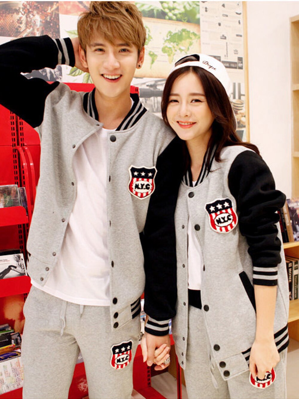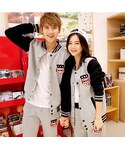 袖部分が切り替えになった、スタジャンとパンツのセットアップです。ユニセックスデザインでレディース&メンズ両方対応なのでカップルのペアルックにもオススメのアイテム。胸元とパンツに取り付けられたワッペン加工がポイントになっていてかわいいです。細身なシルエットなのでダボッと野暮ったくならずにスタイリッシュに着れます。 セットアップに白スニーカーで外しました。