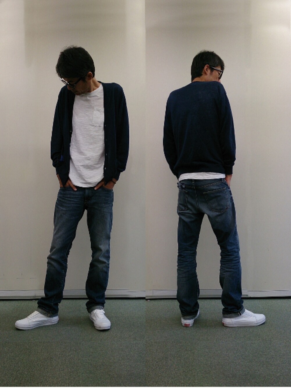 紺色のカーディガンとジーンズに白いスニーカー。 チューリップの「虹とスニーカーの頃」みたいな...古ッ それにしても、白いスニーカーが眩しいw 太陽の下のスナップだったら雰囲気なんだけどね。
