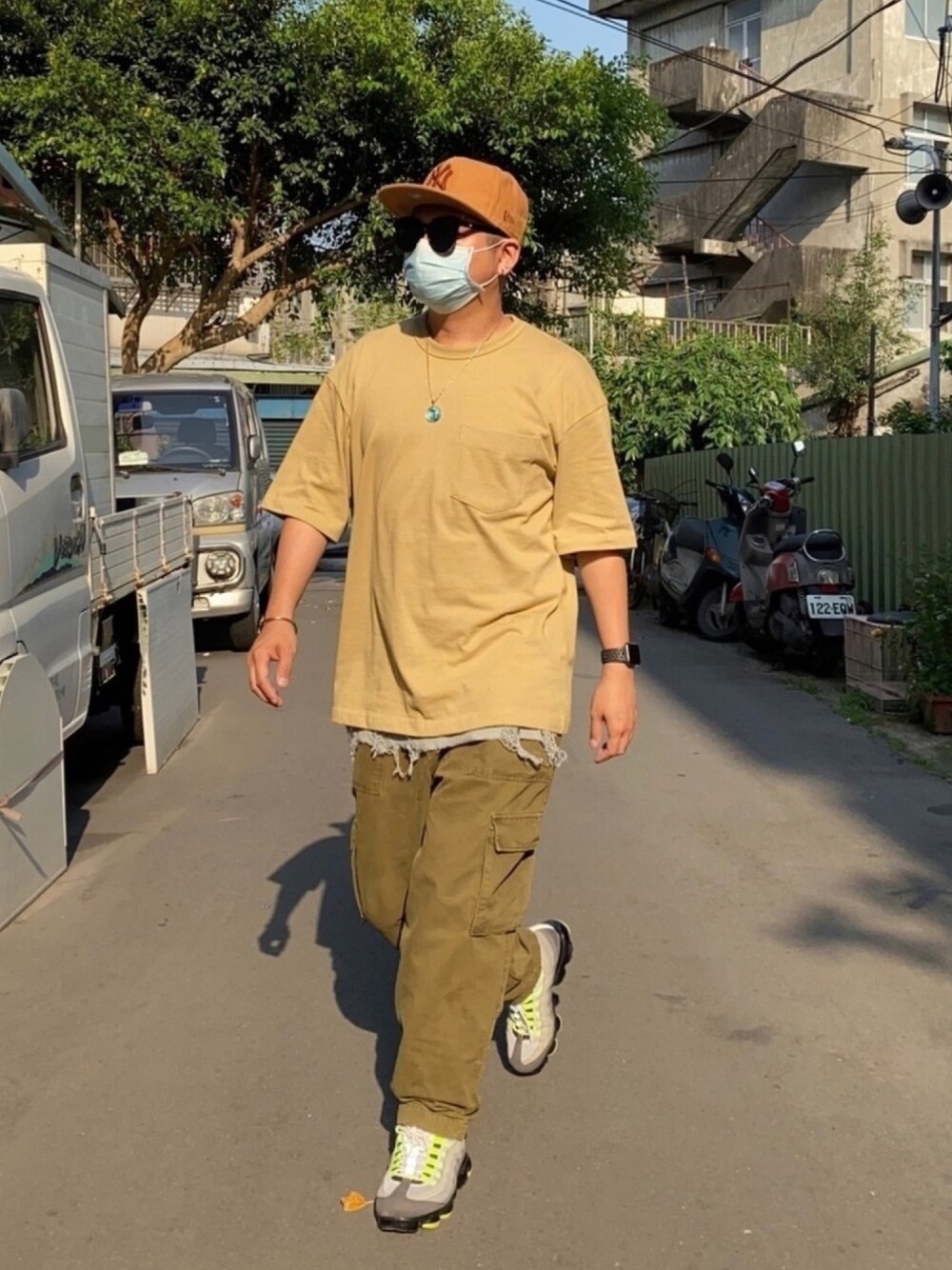 帽子:New Era 球帽 上衣:寬版短T 褲子:多口袋工作褲 鞋子:95air max