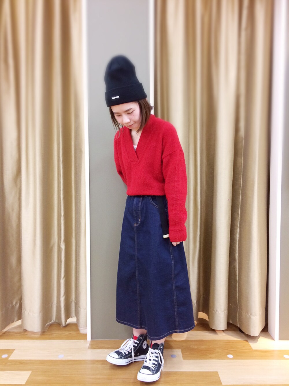 本日のコーディネート ふわふわニットで着心地も良いです! カラーバリエーションも12色ととても豊富でお気に入りの1色を選べます♡ *商品情報* ・60174CB0004 カラフルVネックニットプルオーバー ¥2,149 ・60173L10000 WRデニムスカート ¥5,389