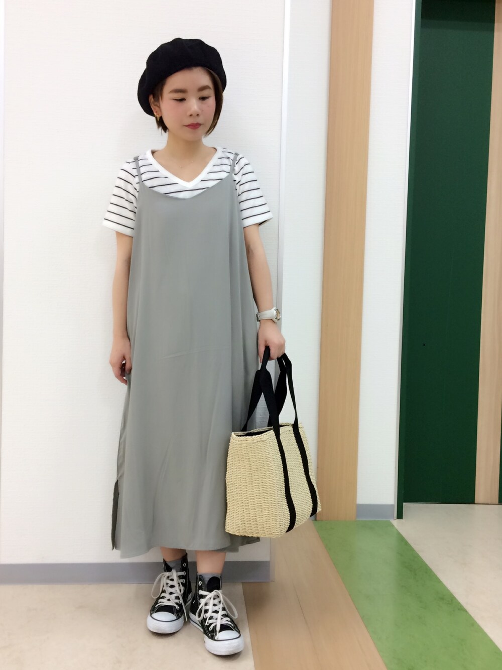 本日のコーディネート さらっと1枚で着回し抜群のワンピースです! ストラップは長さの調節が可能です。 シンプルなコーディネートなので小物は黒でまとめました(*^^) *商品情報* ・65171H00010 RAY キャミワンピース¥4,212 ・60176C10010 VネックボーダーTシャツ ¥1,609 ・65171J10000 ベレー ¥2,700