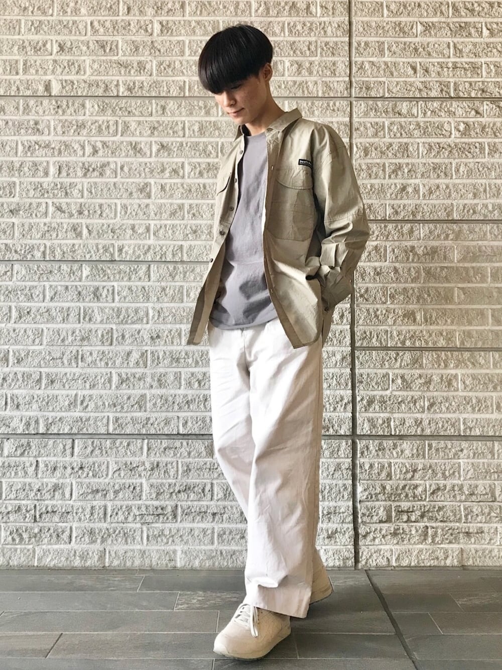 パンツとシューズを同系色に合わせることで脚長効果に✨ 顔元に白が抵抗ある人にオススメです🙆♂️