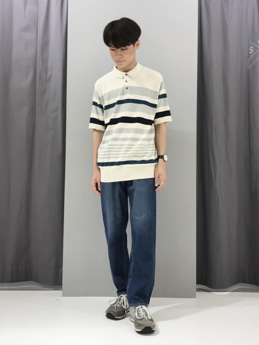 襟付きニットTシャツは、綺麗な配色のボーダがポイントです✅ ストレートパンツとあわせ、年代問わず着用できるコーディネートに🙆♂️