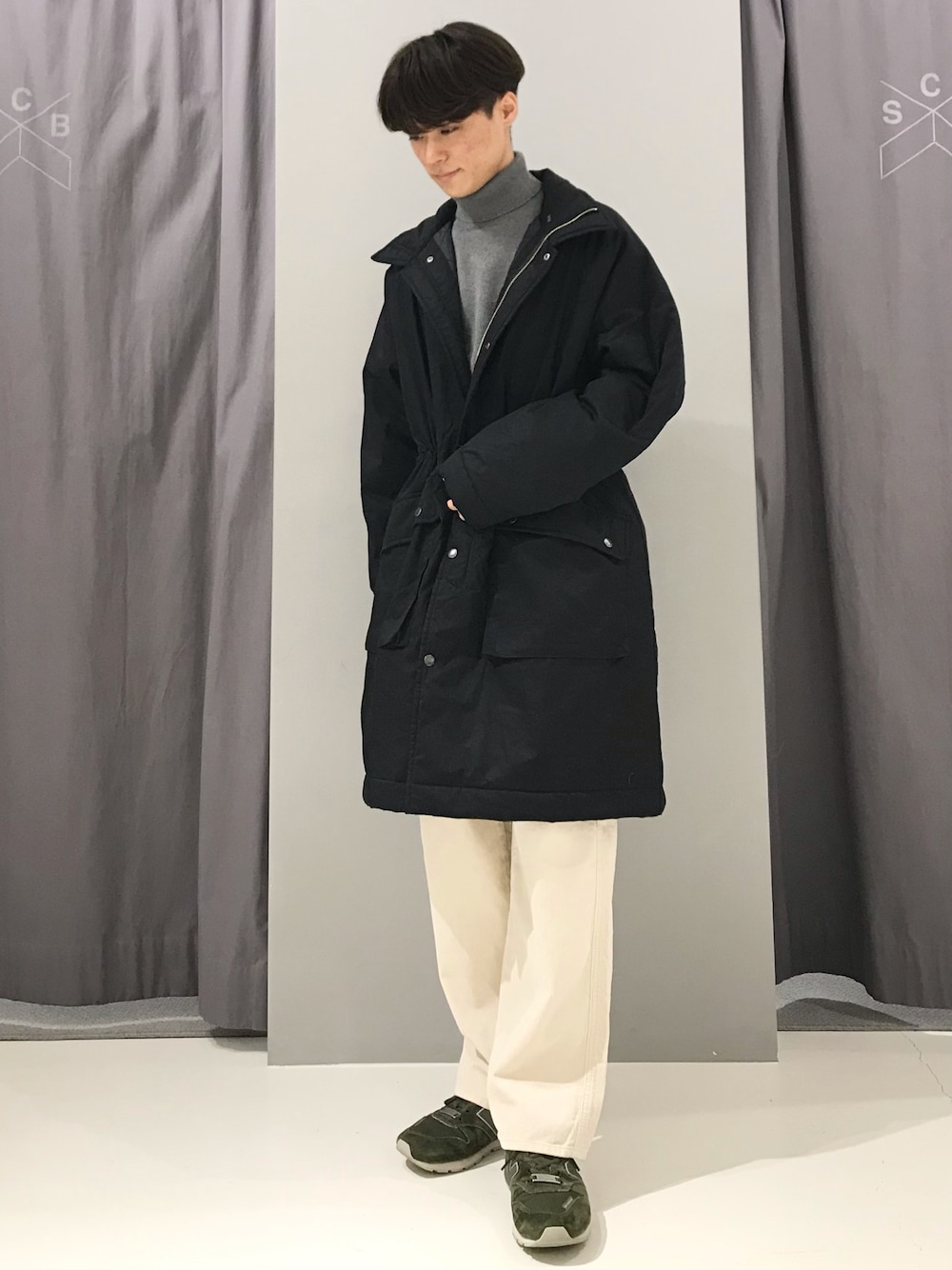 絞れるミリタリーコートとタートルネックニットで上品ながらも抜け感のあるコーデに