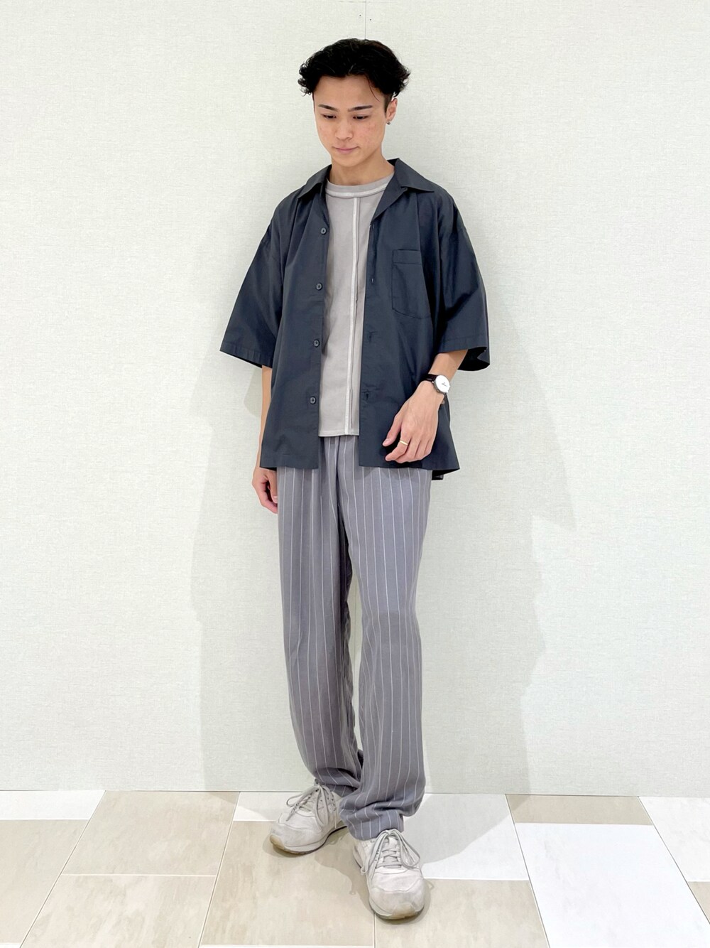 グレーカラーで合わせたワントーンスタイル🐭 チャコールグレーカラーのシャツが締りのある夏コーデにしてくれます🌴