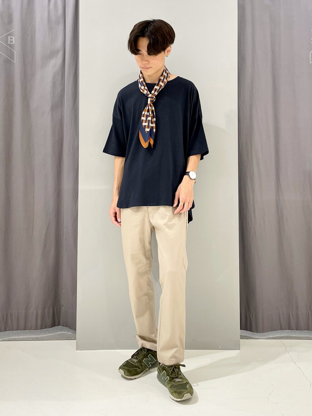 キカガク柄スカーフでアクセントのある夏コーデにしました 🟧🟦🟫 淡めのパンツと合わせて抜け感をプラス👍