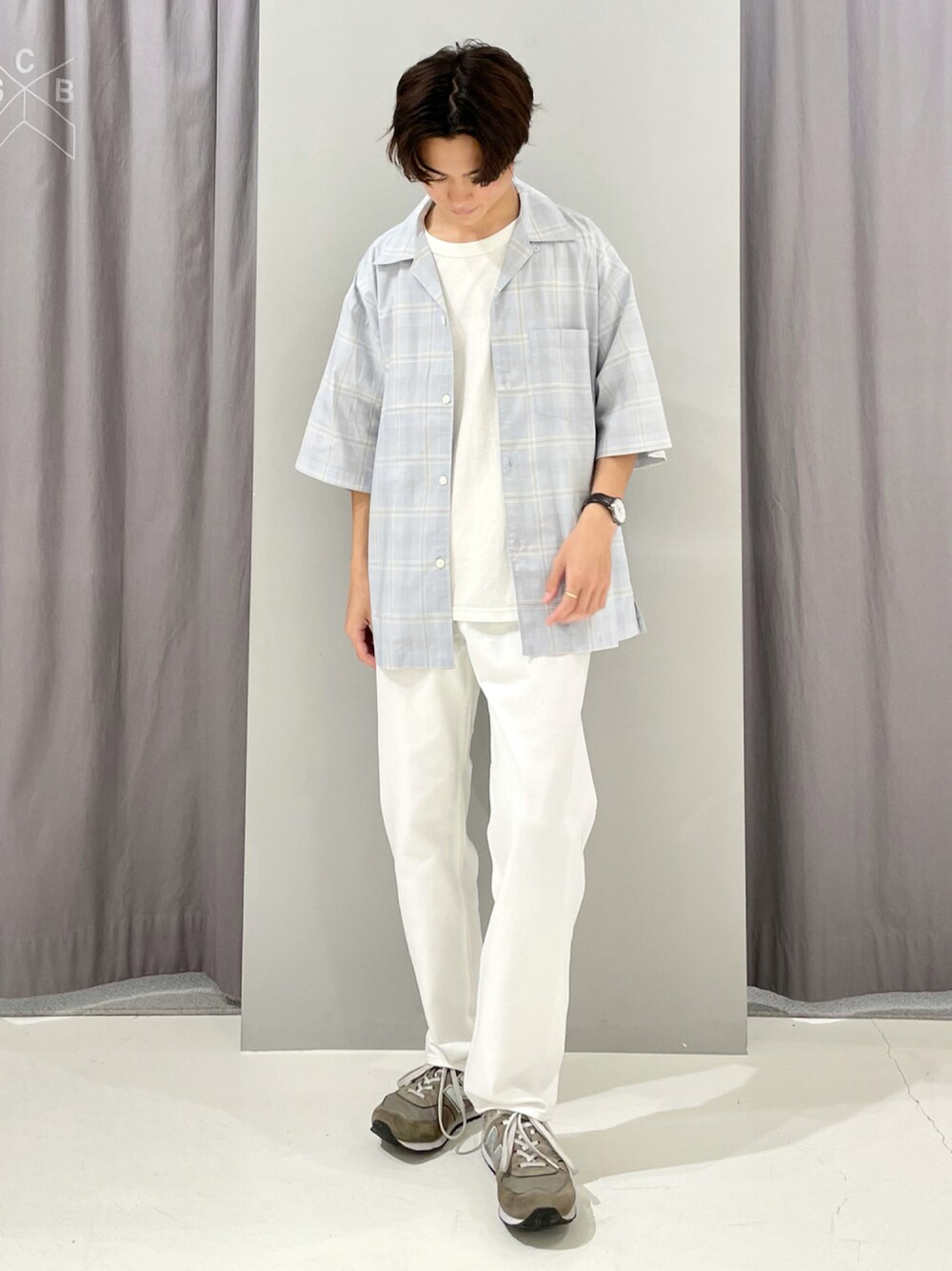 明るめカラーでまとめ、開放感のある夏コーデにしました🧁 程よいアクセントになるチェック柄シャツで、こなれ感のあるスタイルが作れます👍