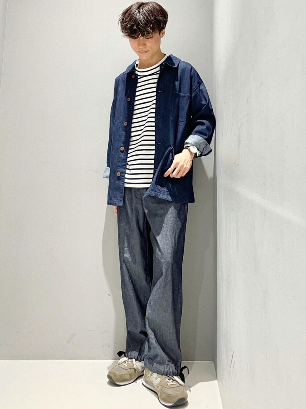 デニムのカバーオールとボーダーTシャツで、定番のマリンコーデにしました🐠 ブルー系統でパンツも合わせて統一感のあるスタイルに🙆♂️