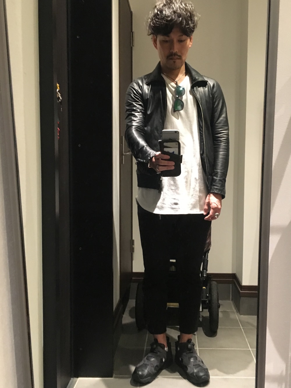 レザージャケットを使ったモノトーンコーデ👶 ボトムはポンチ素材のアンクルパンツで足元はスニーカーでスポーツ感出してます。😎 後ろにベビーカー写ってましたw