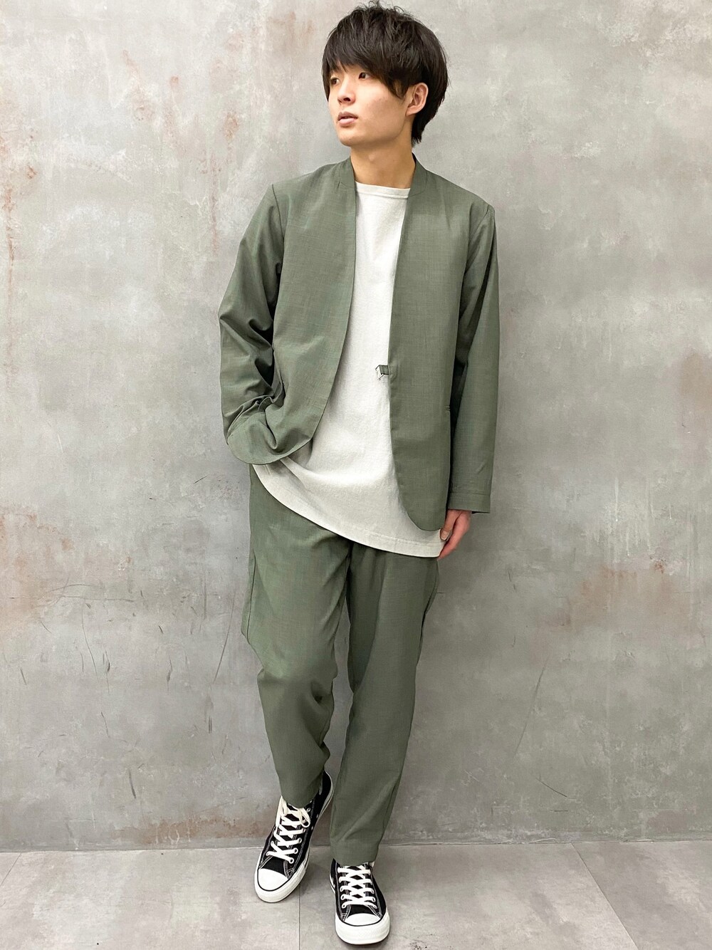 172cm/62kg/やや痩せ型 ※着用サイズ ジャケット:Mサイズ(グリーン) ロンT:Mサイズ(知らない街のコンクリート) パンツ:Mサイズ(グリーン) 【決めすぎないジャケットセットアップ】 タイロッケンジャケットのセットアップコーデ。 ジャケットのセットアップですが、 ノーカラーなのでテーラードジャケットと比べて 程よく抜け感のある印象に。 ただ、タイロッケンのベルトを締めて使えば グッとクラシカルで上品な印象に仕上がります。 オンとオフを両方楽しめるセットアップです◎