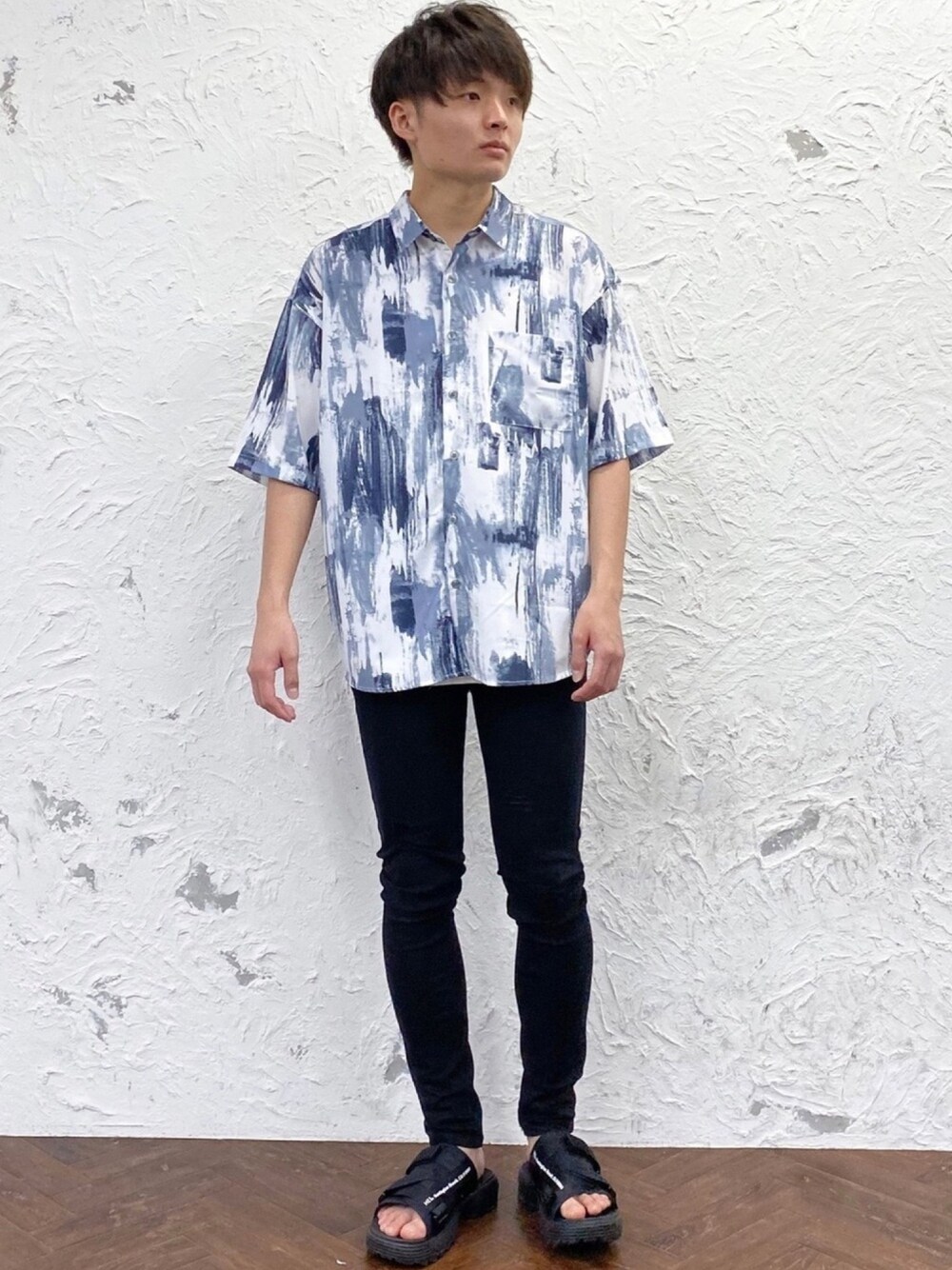 172cm/62kg/やや痩せ型 ※着用サイズ ◎シャツ:Lサイズ(ペイント) →余裕のあるゆったりシルエットです! ◎パンツ:Lサイズ(ダメージ) →タイトですが、Mサイズよりはゆとりを感じます。 【爽やか総柄シャツコーデ】 ブルーのペイント模様が目を引く半袖シャツに ダメージのスキニーパンツを合わせて、 カジュアル感の強いコーデに仕上げました。 デイリー使いにぴったりなテイストのコーデで、 夏らしい爽やかな印象に仕上がります。