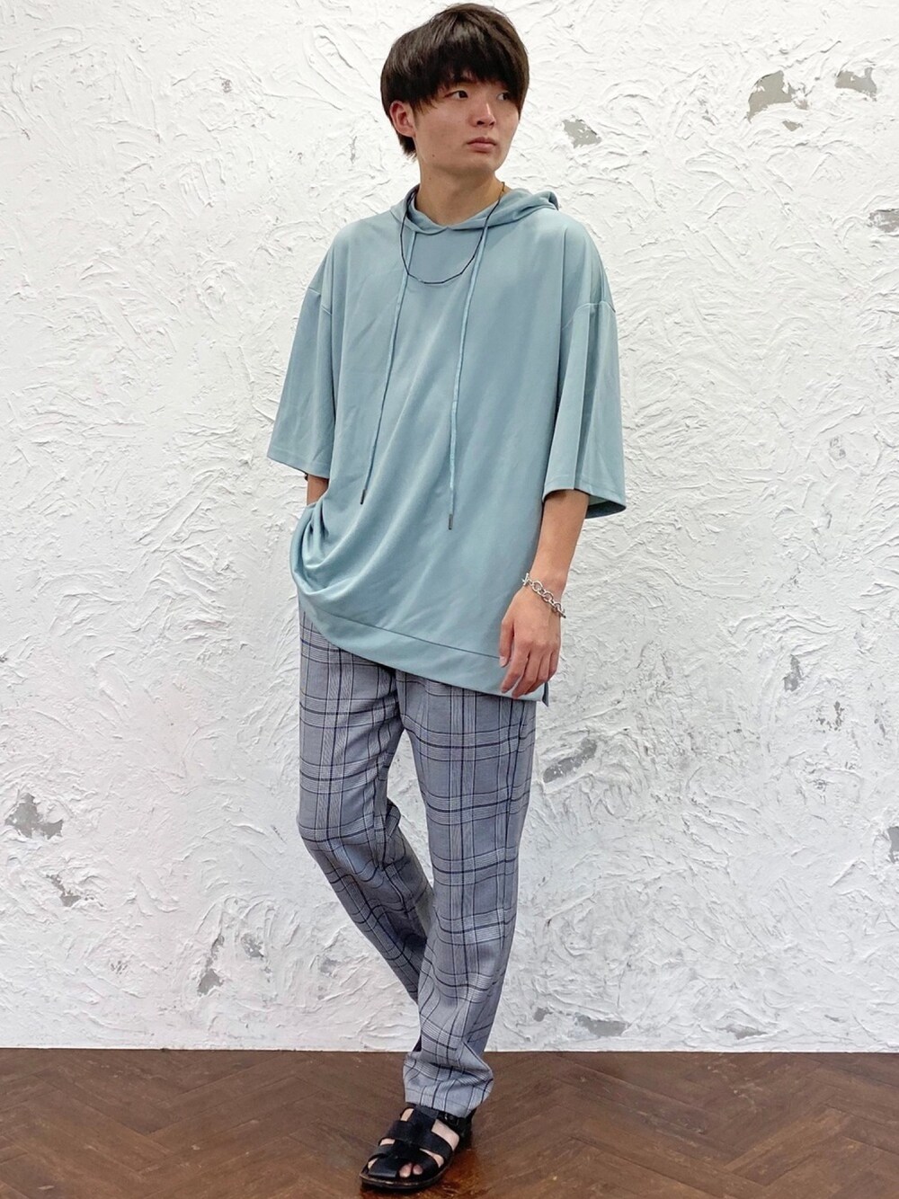 172cm/62kg/やや痩せ型 ※着用サイズ ◎パーカー:Mサイズ(ライトグリーン) →しっかり目のオーバーサイズです! ◎パンツ:Mサイズ(グレーチェック) →ウエスト、丈感ともにちょうどいいサイズ感です! ◎サンダル:Lサイズ(ブラック) →足のサイズは26.5ですが、ちょうどいいサイズ感です。 【夏の爽やかチェックコーデ】 ライトグリーンのパーカーと、 グレーとチェックパンツを合わせた 爽やかコーデ。 パーカーはとろみのある素材で、 リラックス感抜群です♪