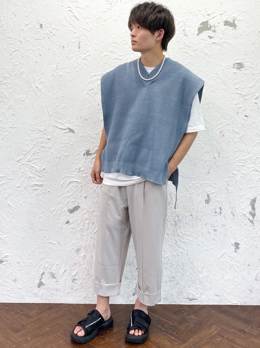 着用サイズ ◎ニットベストアンサンブル:Mサイズ(ブルーグレー) →オーバーサイズで、余裕のある着心地です。 ◎パンツ:Mサイズ(アイスグレー) →アンクル丈で、すっきりした印象に仕上がるパンツです。 ◎サンダル:Mサイズ(ブラック) →足のサイズは26.5ですが、ちょうどいいサイズ感です。 【爽やか色ベストコーデ】 ニットベストのアンサンブルと、アンクルパンツを合わせた スッキリした印象のコーデ。 明るめの色味で統一し、 清潔感あふれるコーデに仕上げました。 シンプルになりがちな夏のコーデは、 今期トレンドのニットベストでアクセントをつけてみてください♪