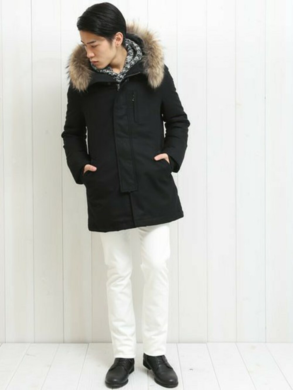 冬に欠かせないダウンもウール素材を選び、白パンを合わせて上品なイメージにしました。