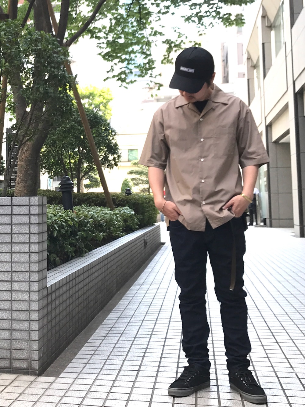 オープンカラーシャツをベースにすっきりしたシンプルコーデ。夏に向けてシンプルになるスタイルにアクセサリーやベルト、キャップといった小物使いがポイントです。