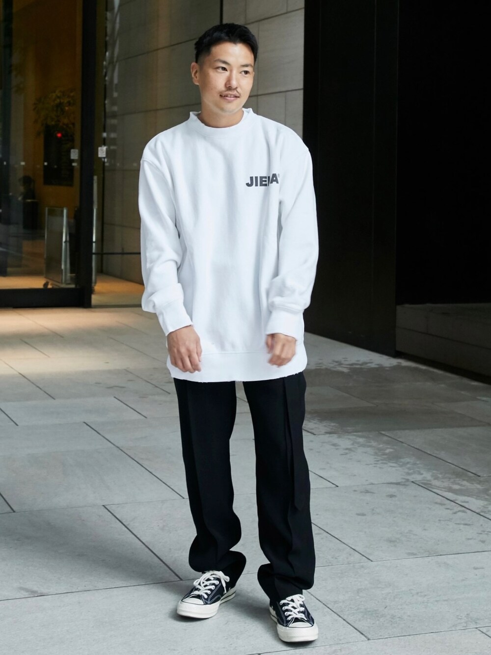 ホワイト系のスウェットを着用したメンズの秋コーディネートの1枚目の写真