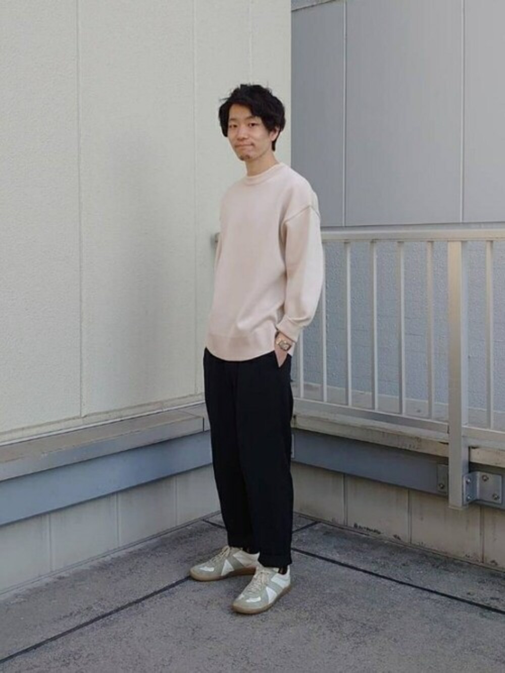 春先1枚で着れるニットプルオーバー。 ウエスト部分にリブはなくすっきりしているのでアウターの下にももたつかずに着用できます。 ピンクベージュの色味も季節あってオススメです。