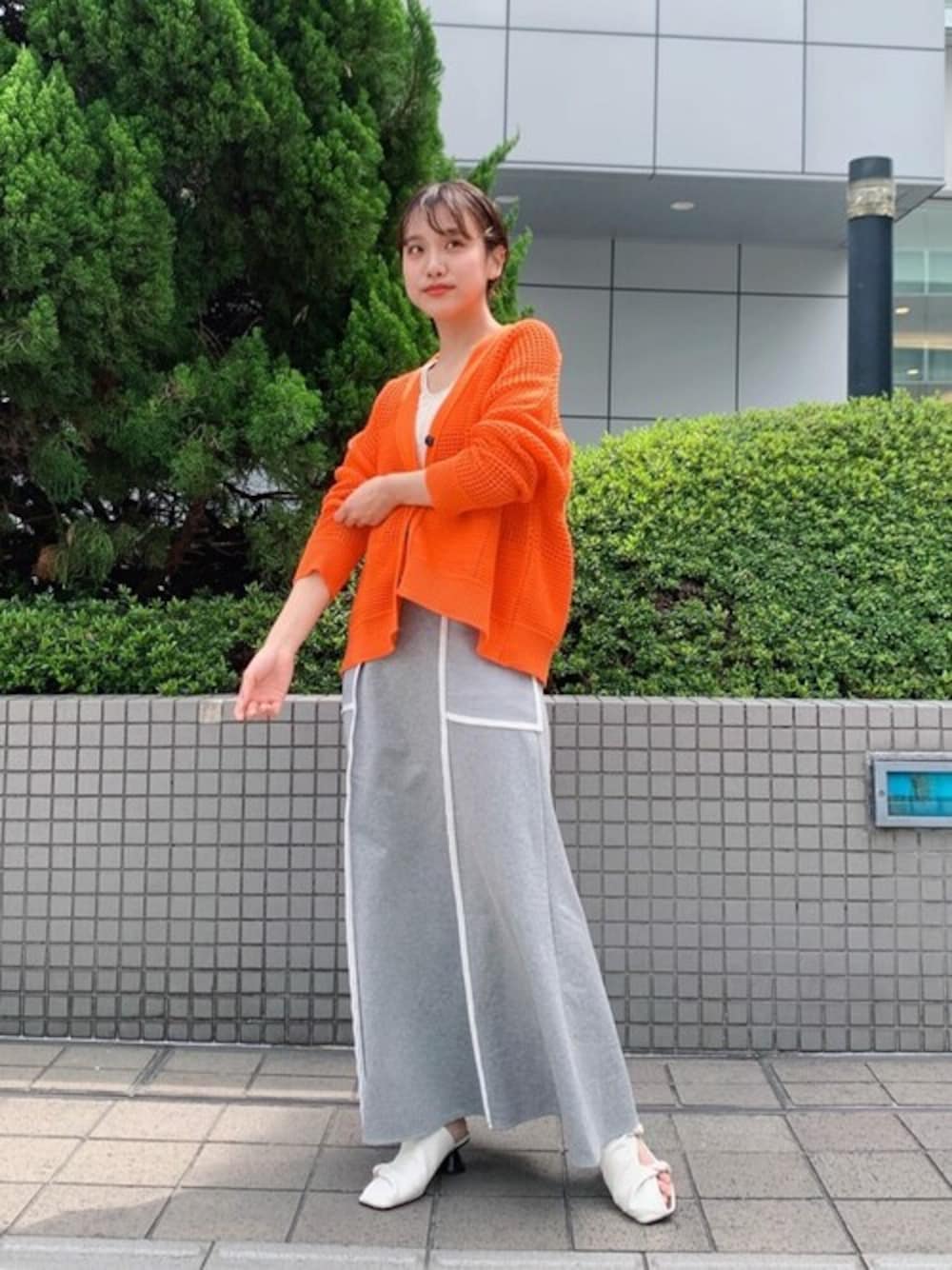 ボックスシルエットのカーディガンはどんなボトムスにも合わせやすく、着回し力が抜群。 肌馴染みが良いトレンドのオレンジ色で、普段カラー物あまり着ない方にも挑戦して頂きたいです! スカートは履き心地が抜群の美シルエット。 私も一目惚れでした!