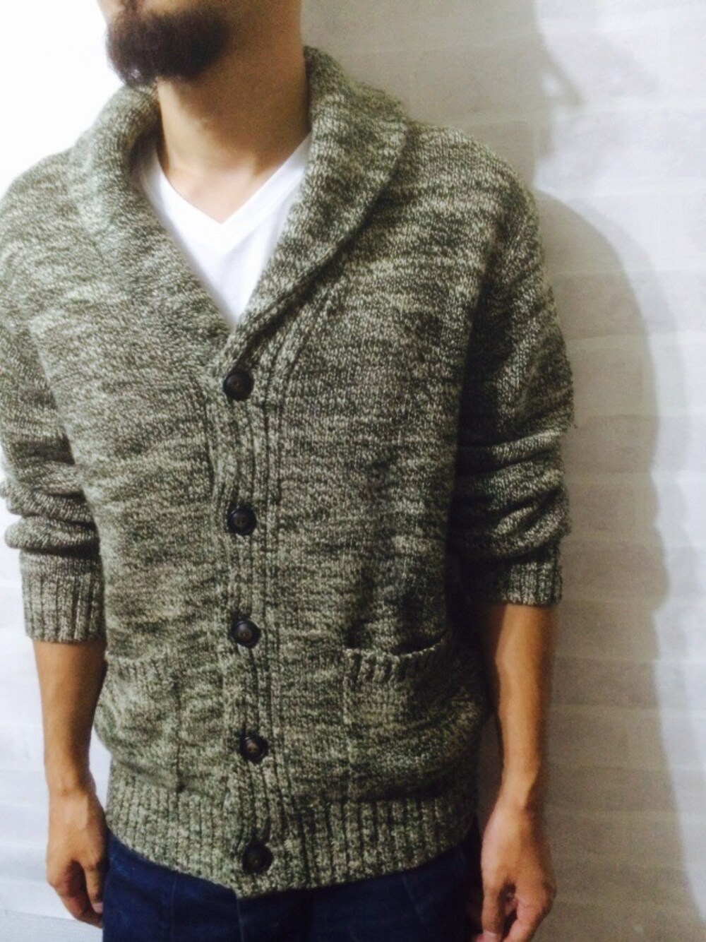 グリーン系のニット/セーターを着用したメンズの秋コーディネートの1枚目の写真