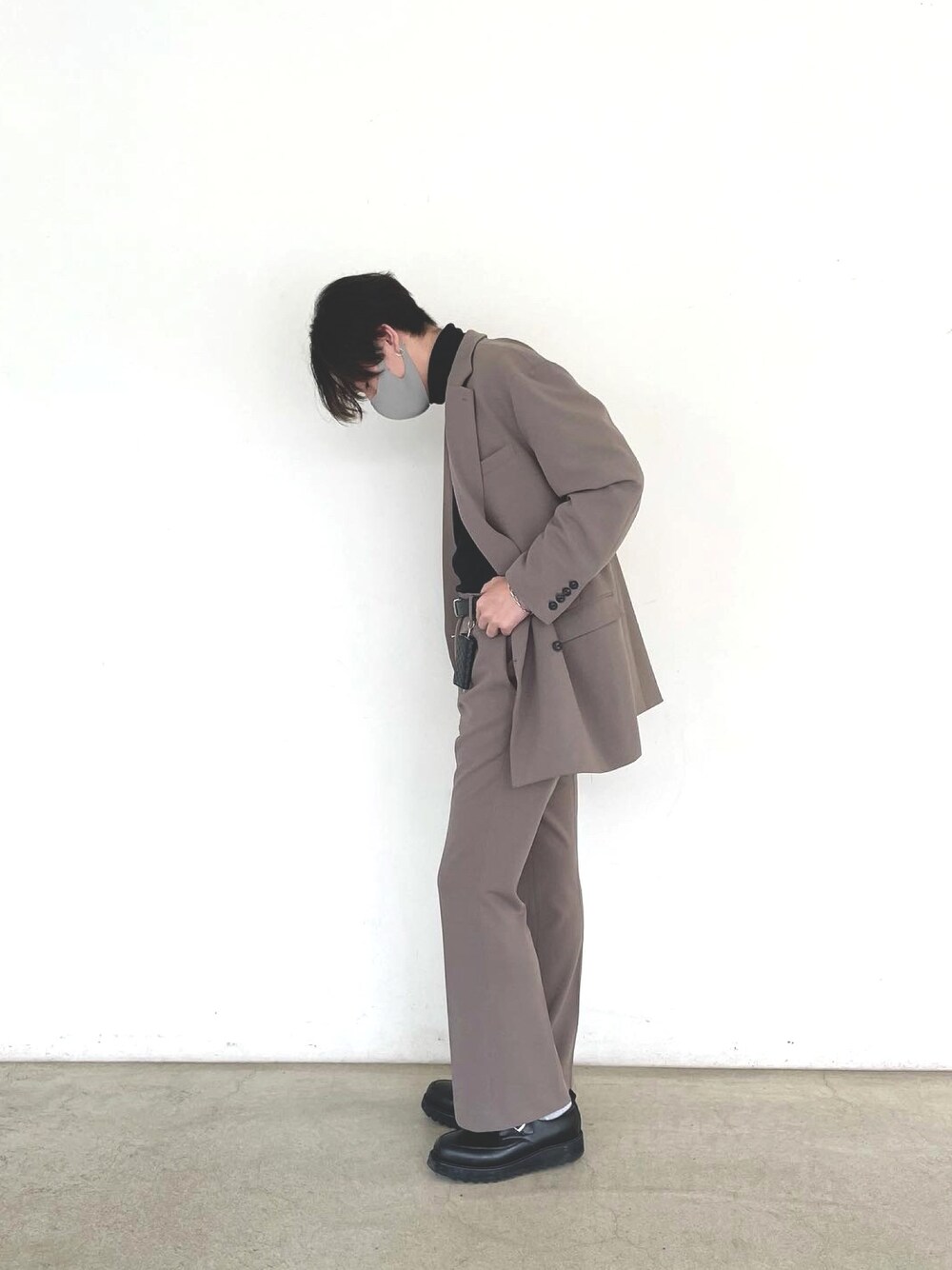 フレアパンツのブラウン系セットアップ 僕ウエストがあるからちょっと太く見えちゃうけど、それでもスタイル良く見えるよ:)