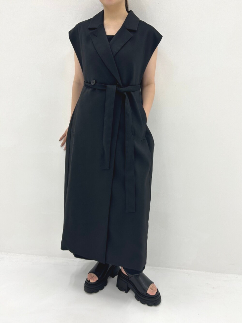ブラック系のベストを着用したレディースの夏コーディネートの1枚目の写真