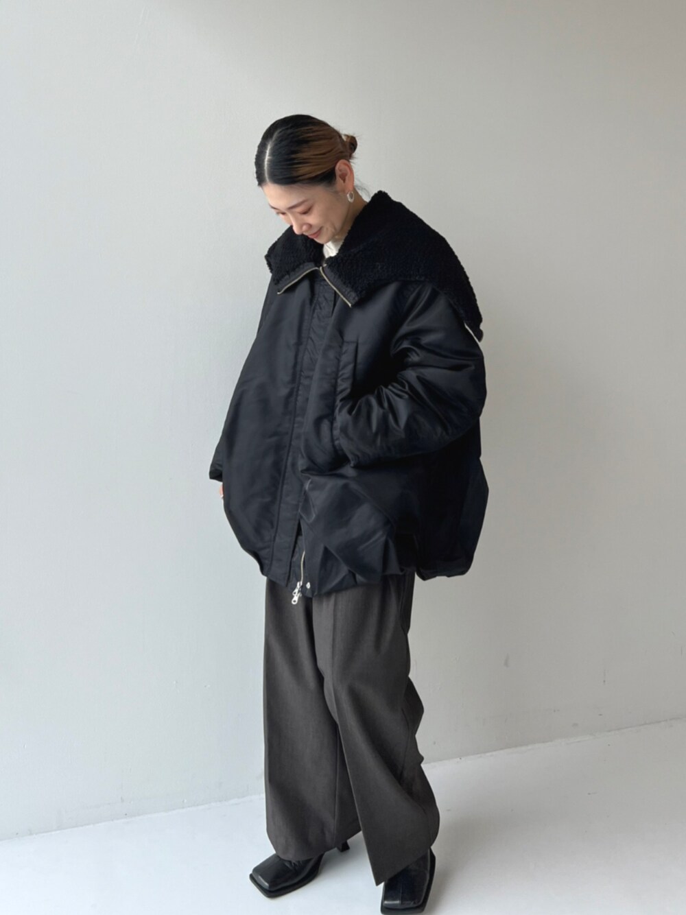 ブラック系のブルゾンを着用したレディースの秋コーディネートの1枚目の写真