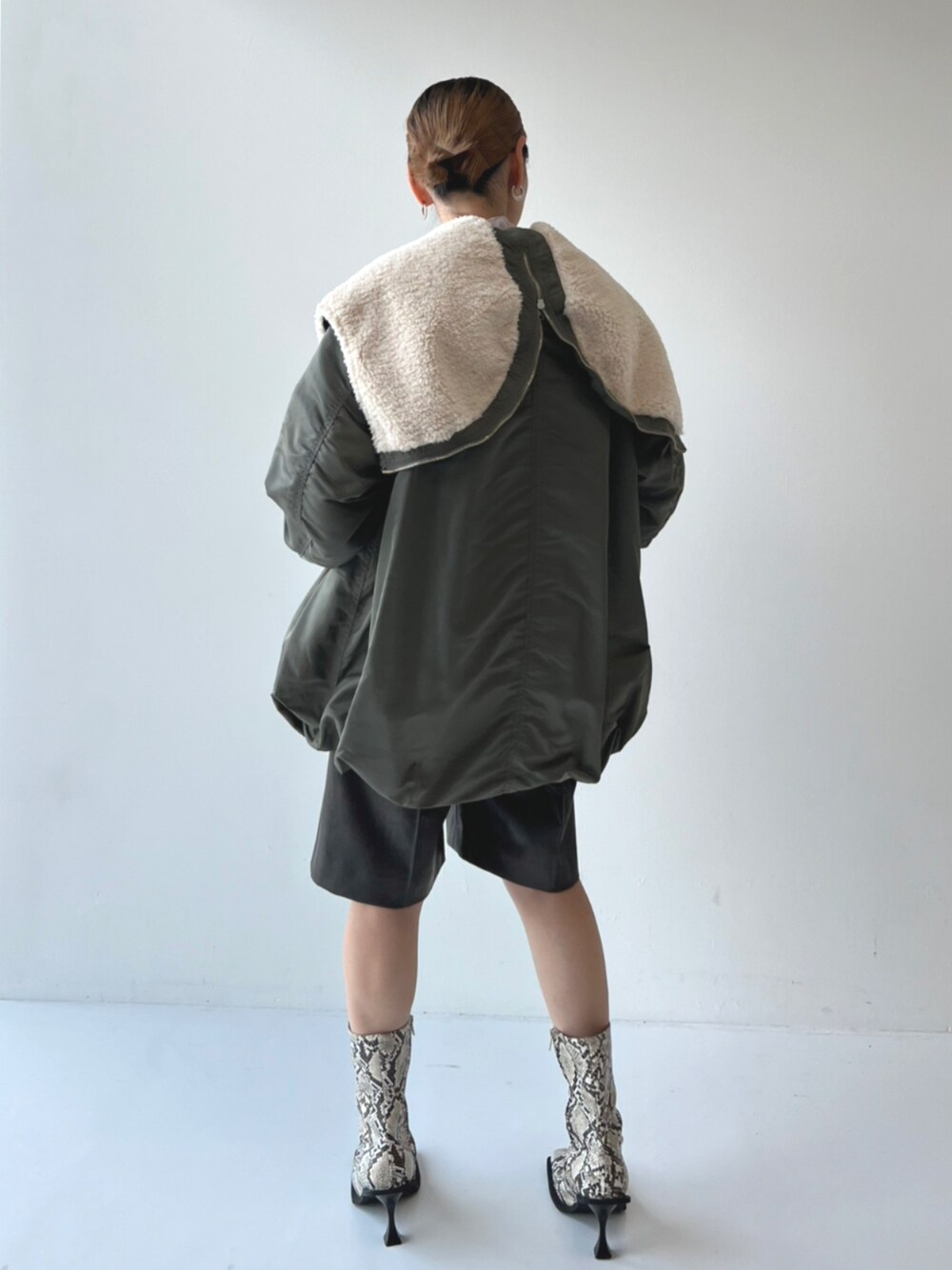 グリーン系のブルゾンを着用したレディースの秋コーディネートの1枚目の写真