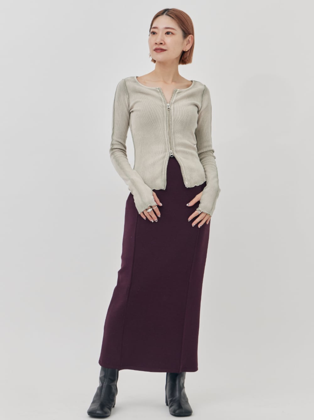 STUDIOUS STAFF(STUDIOUS WOMENS)のカーディガン/ボレロ「【STUDIOUS/ステュディオス】《モードに-5㎏見え》ジップアップリブトップス/カーディガン」を使ったコーディネート