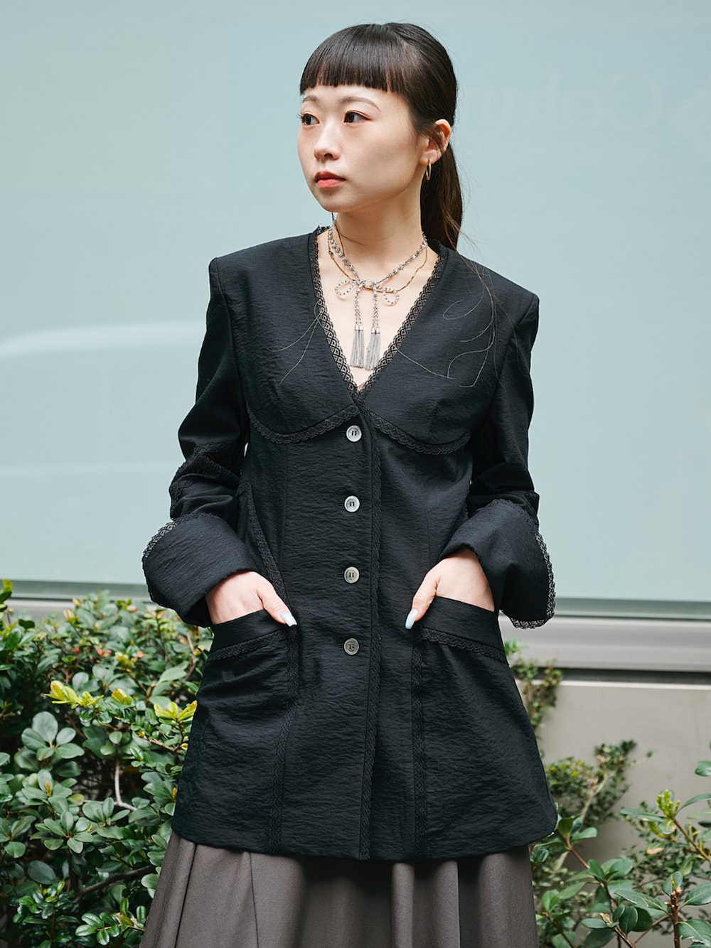 STUDIOUS STAFF(STUDIOUS WOMENS)のノーカラージャケット「【FETICO/フェティコ】《STUDIOUS別注》別注 LACE-PANELED JACKET/レースパネルドジャケット/シャツジャケット」を使ったコーディネート