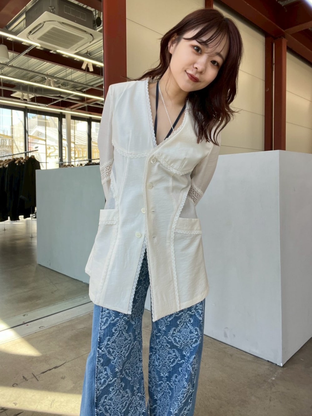 STUDIOUS STAFF(STUDIOUS WOMENS)のノーカラージャケット「【FETICO/フェティコ】《STUDIOUS別注》別注 LACE-PANELED JACKET/レースパネルドジャケット/シャツジャケット」を使ったコーディネート