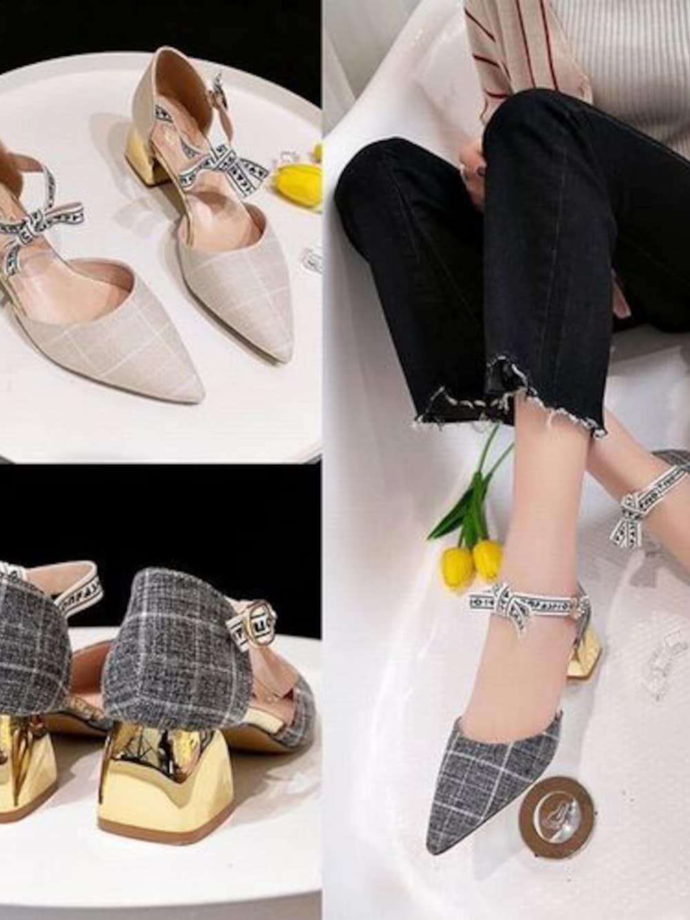 新作アイテム 【チェック柄ゴールドヒールパンプス】 ¥2,900