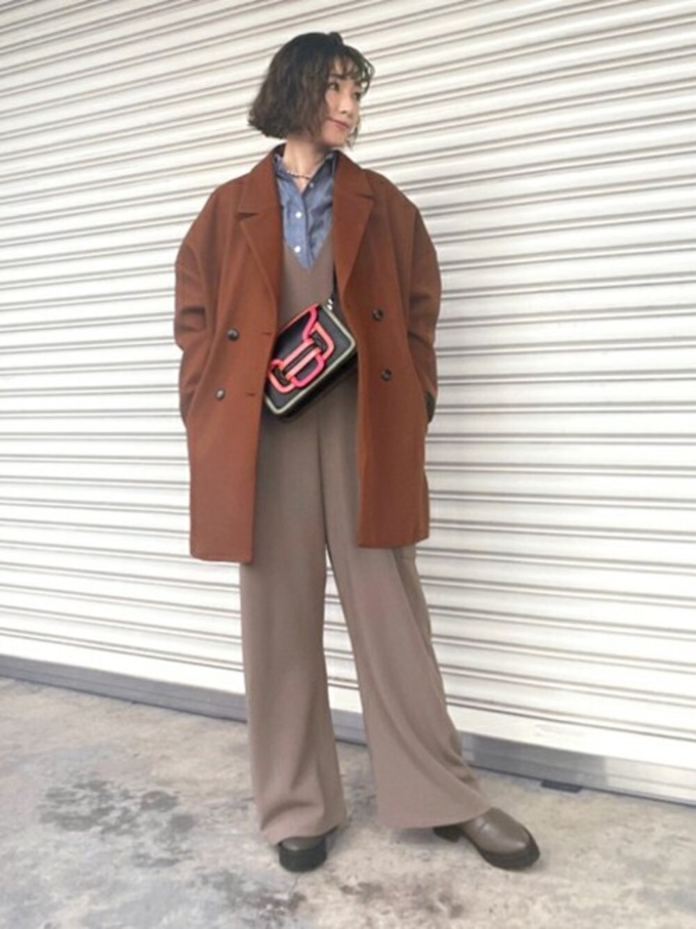 少しレンガ系の赤味を持つ発色で、老け見えせずに抜群のオシャレ感が出せるブラウンのPコート。 サロペットのフォルムの可愛さを活かすには、ミドル丈のコートがお役立ちです。 このコートはゆったりしていて軽く、ホントにリラックス気分で着れるのでお薦めです。 このサロペットはクセが無い発色だから、どんな色とも合わせやすいのが特徴。 赤味ブラウンに反対色のブルーやら派手ピンクやらを入れてもうるさくならない、凄い実力を活かして組んだ私服コーデです。