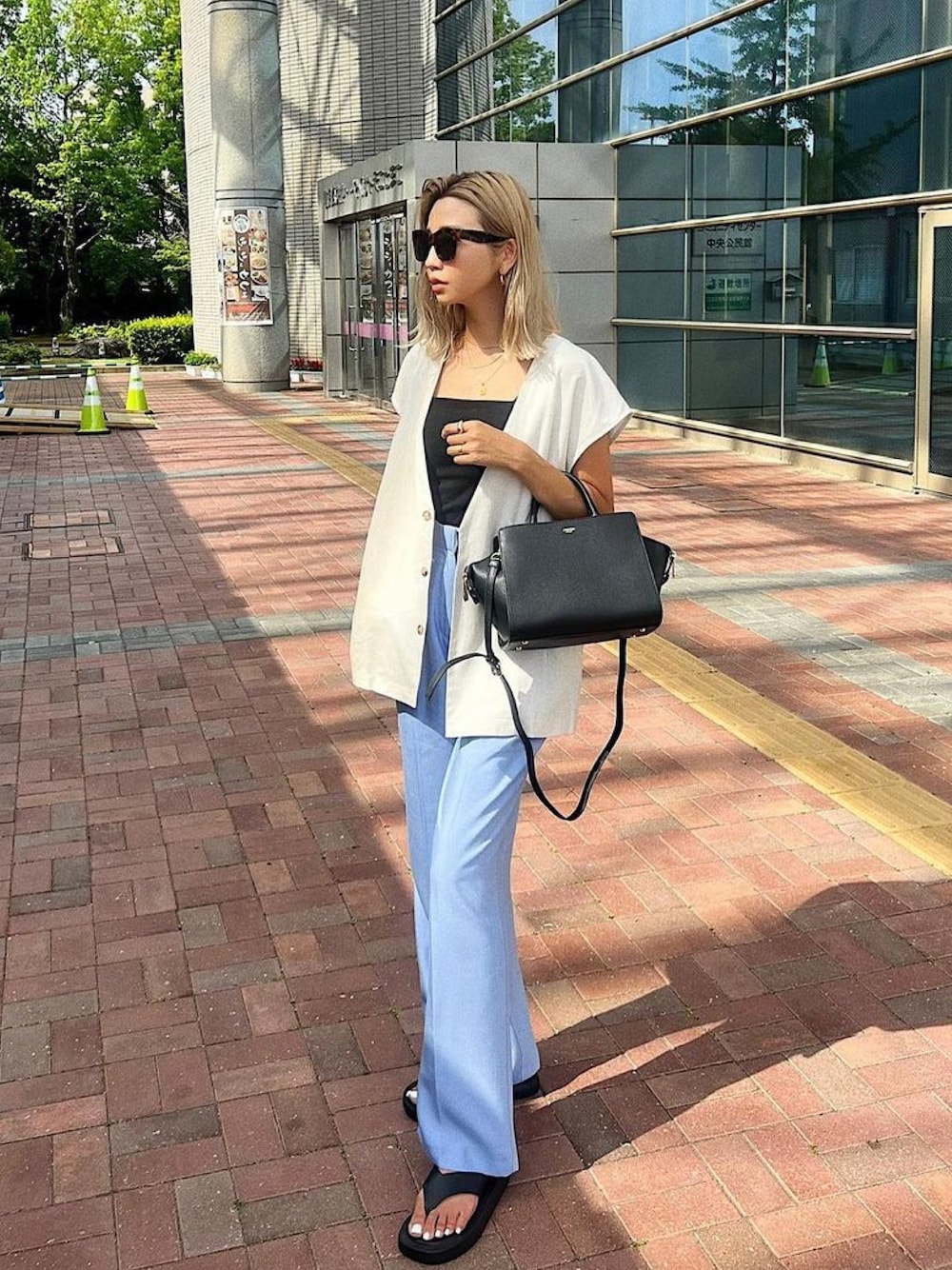 ベージュ系のベストを着用したレディースの夏コーディネートの1枚目の写真