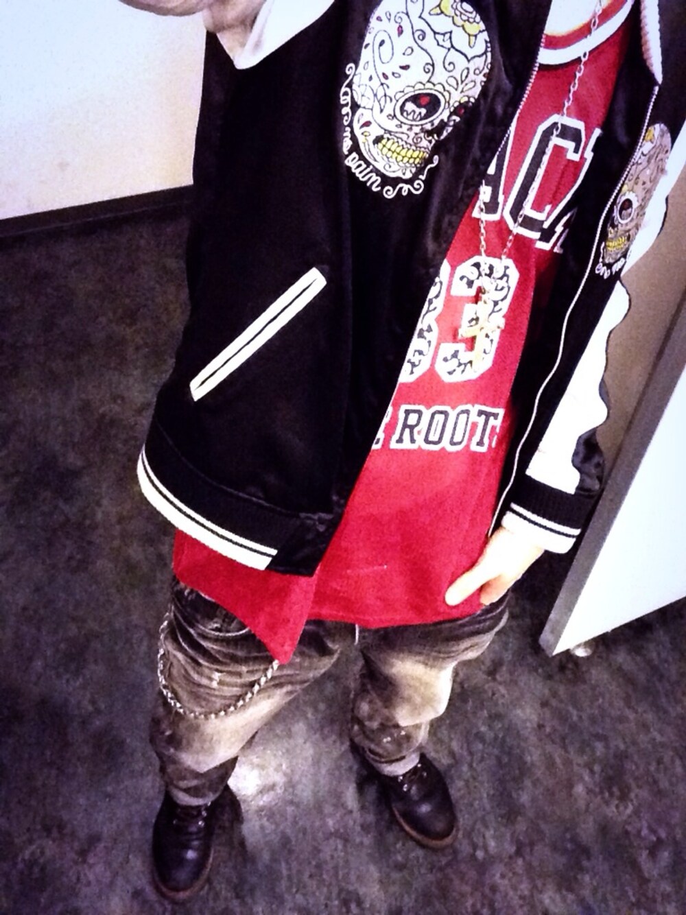 スカジャンとメッシュタンクトップで組んだ BLACK FLAMEストリートコーデ! アウター BLACK FLAME トップス BLACK FLAME デニム BLACK FLAME ブーツ RED WING アクセ OF THE NEIGE STYLE