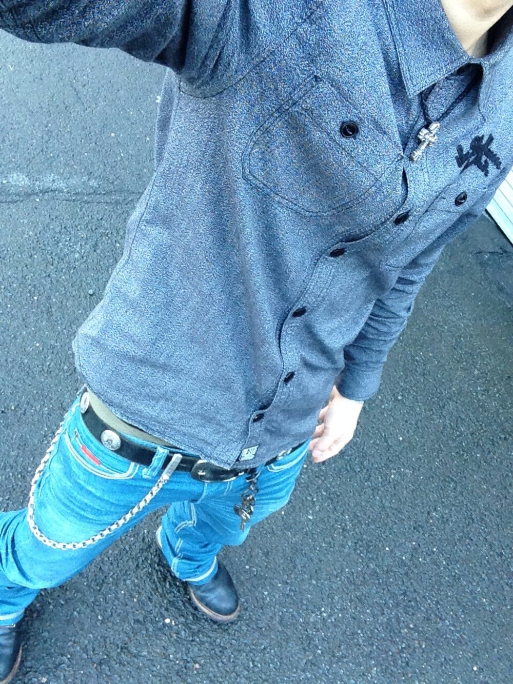 トリプルステッチのデニム! ブーツ等に圧倒的に立体感がでて かなりかっこいい一本! シャツ BLACK FLAME デニム OF THE NEIGE STYLE ブーツ RED WING ベルト BLACK FLAME アクセ CHROME HEARTS OF THE NEIGE STYLE