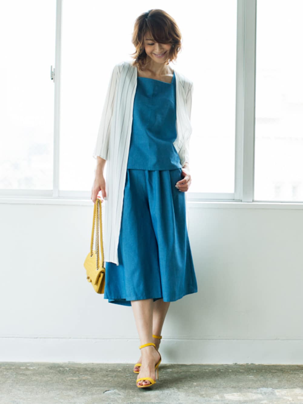 サラっとした質感がより涼しげな印象を与えてくるデニムのセットアップ。 はやりのワイドパンツと、シルエットが華奢なバッグとサンダルが好相性です。 ブルーにビタミンカラーのイエローを投入して夏らしさを意識して。