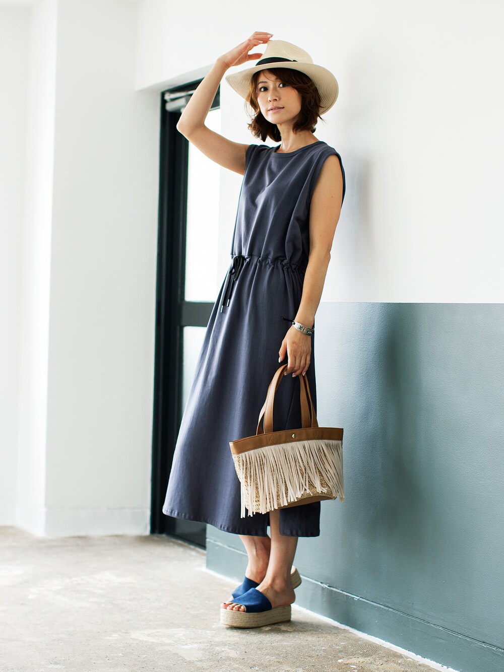 夏の大人カジュアルなコーディネート。 シンプルかつナチュラルなネイビーのワンピースにハットとタッセル付きのバッグを合わせて。厚底のサンダルでさらに女性らしさをきわだたせて。 スタイリスト:川村桃子