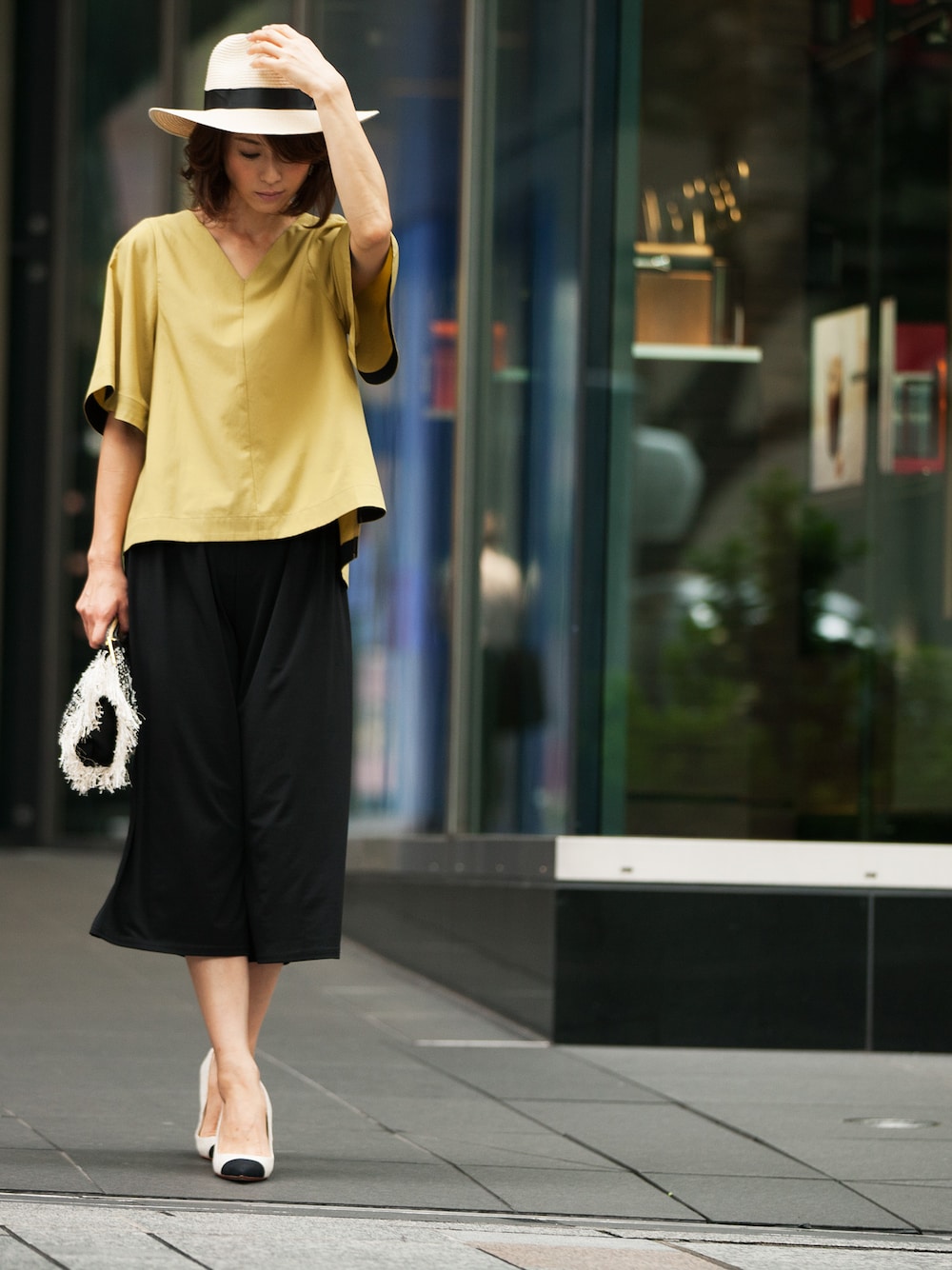 今季おすすめなVネックのバイカラーブラウスを取り入れたコーディネート。 ボトムスはワイドパンツと合わせることで、コンサバスタイルが完成。 スタイリスト:川村桃子