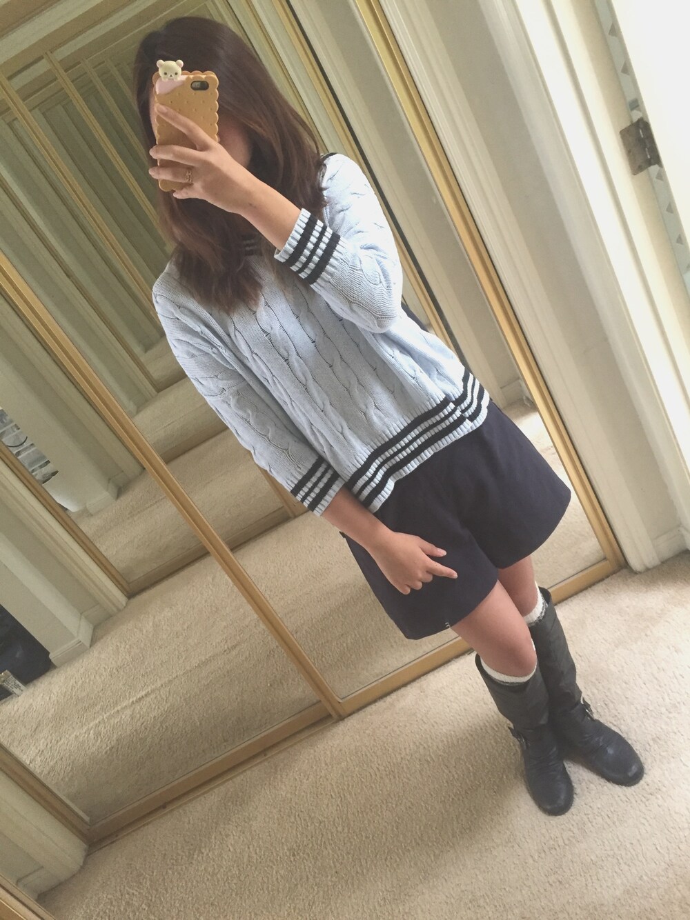 When it's both cold and warm outside, an oversize knit sweater with a skort goes perfect for the day. Black boots and knee high socks adds warmth and a little style to the outfit.
