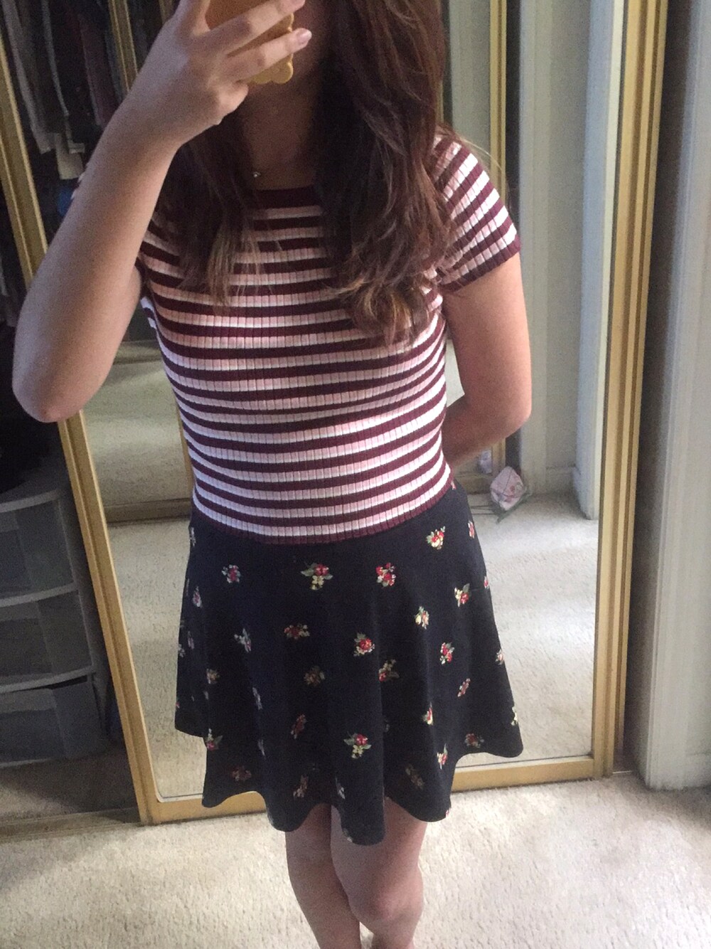 Throwing it back to the 80s~ a striped crop top surprisingly goes well with a floral black skirt. Pair it with flats or sneakers