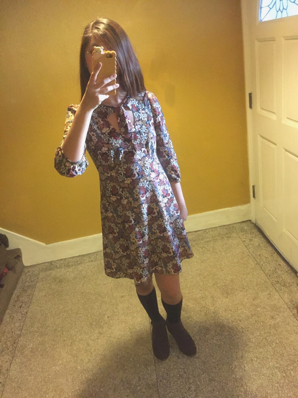 An 80s style dress for fall! It is a elbow sleeve with a choker neckline which you can tie it into a ribbon. The size was a little too big so I wore a lace bra top underneath the dress so it was safe to show. If it is big around the chest area, get a bobby pin and pin it. It may show but a little gleam of silver is an accent. Pair this outfit with a long black sock and booties! Happy fall!!