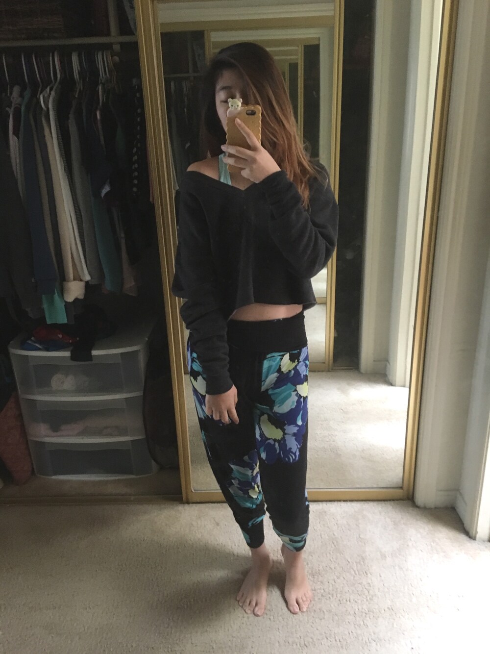 Lounge wear after a workout. A cropped fleece hooded sweatshirt over your sports bra paired with a comfortable jogger! Sexy but also loose to wear around your house or apt.
