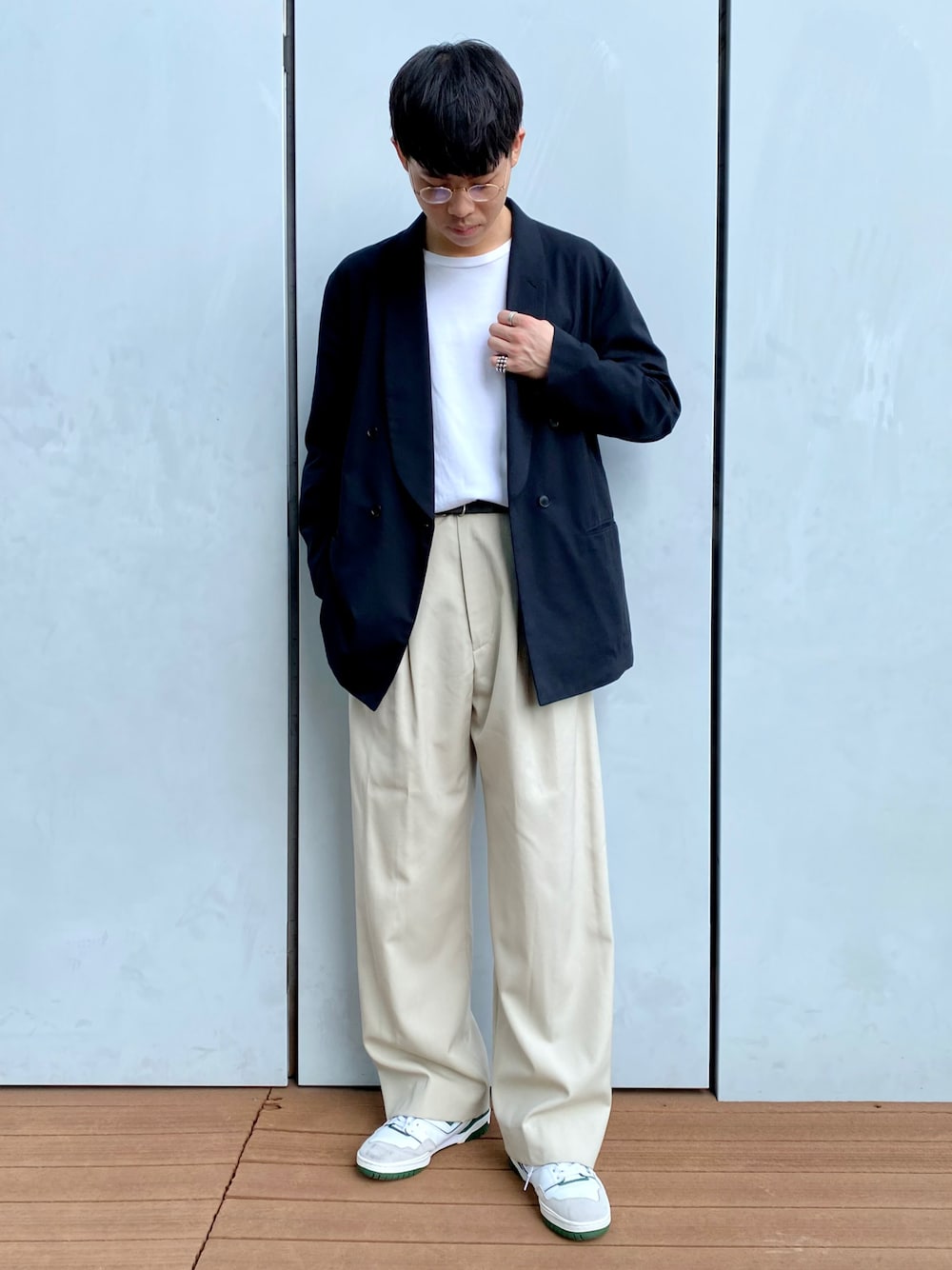 AURALEEのクラシックなテーラードジャケットを、ゆったりしたシルエットとNew Balanceスニーカーでカジュアルダウンさせて、バランスをとりました。