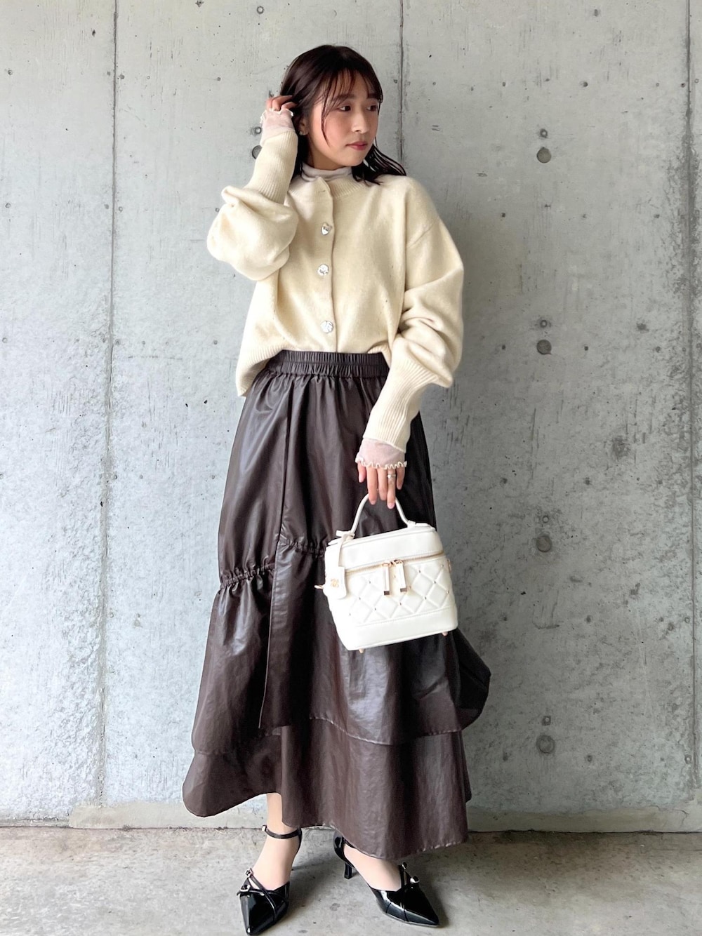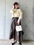 柔らかいイエローのカラーを辛口素材のフレアスカートで個性的に着こなすアクセントレディコーデです。 カーディガンはデニムと合わせてカジュアルにも◎ スカートはスウェットなどのカジュアルアイテムと合わせてレディ見せの役割にしてもおすすめです! 着回しコーディネートを載せてますので、ぜひご覧ください!
