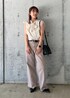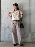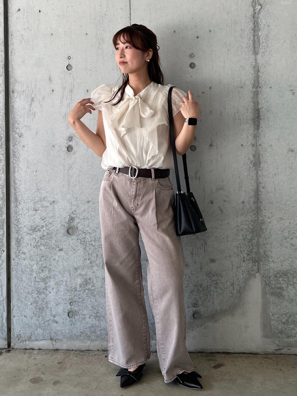柔らかいキナリのリボンブラウスとベージュのデニムを合わせたフェミニンパンツコーデです。 ブラウスはジャケットの中のインナーとしても着映えしておすすめ!お仕事にもぴったりです☺︎ デニムは濃い色のトップスと合わせるとより締まってクールな印象に◎ 着回しコーディネートを載せてますので、ぜひご覧ください!